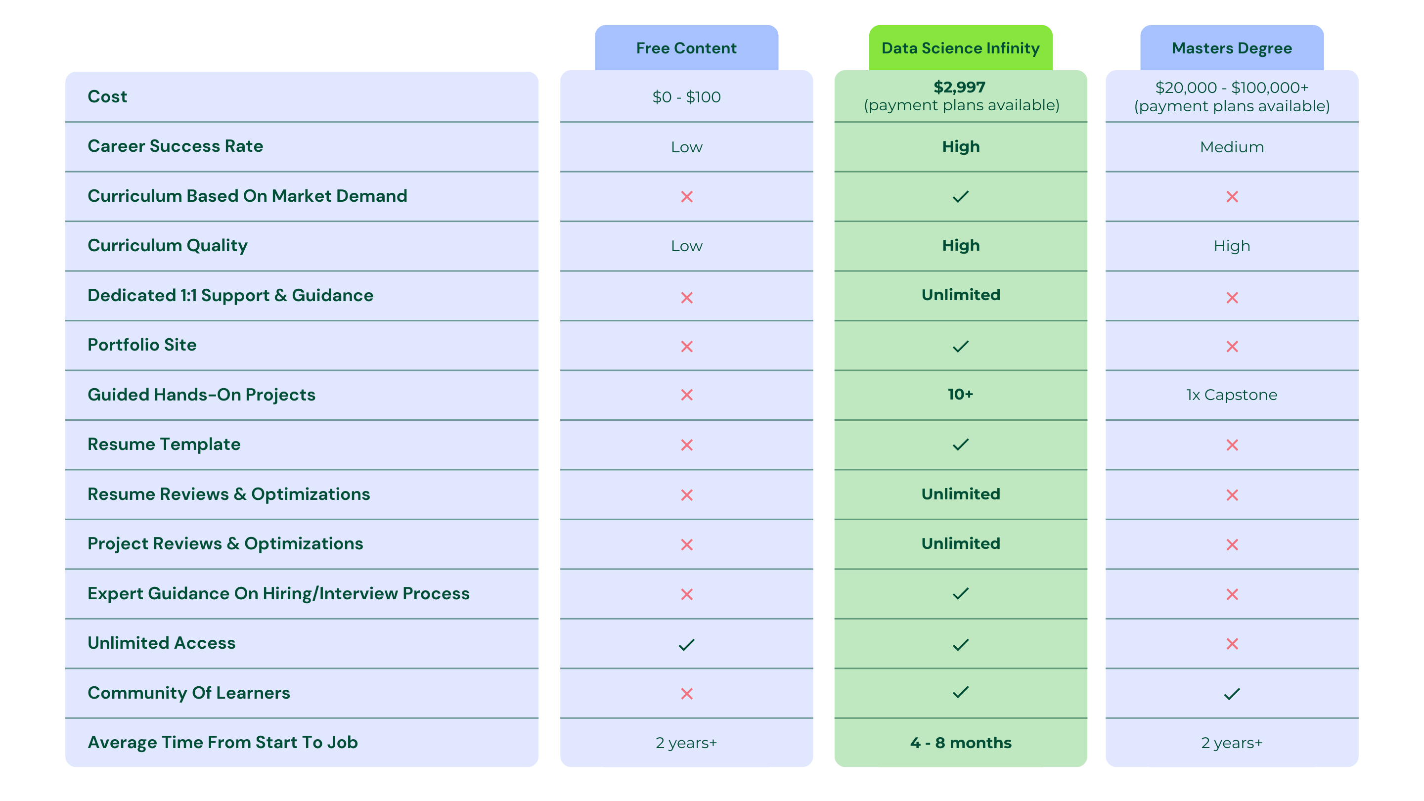 Taking free courses alone, it will take you (on average) 18 months* to get there (if you do indeed get there, many drop out on this pathway).Data Science Infinity students get there (on average) in 6 months. This is a 12-month difference, or in other words, a full year earning that $100k salary.